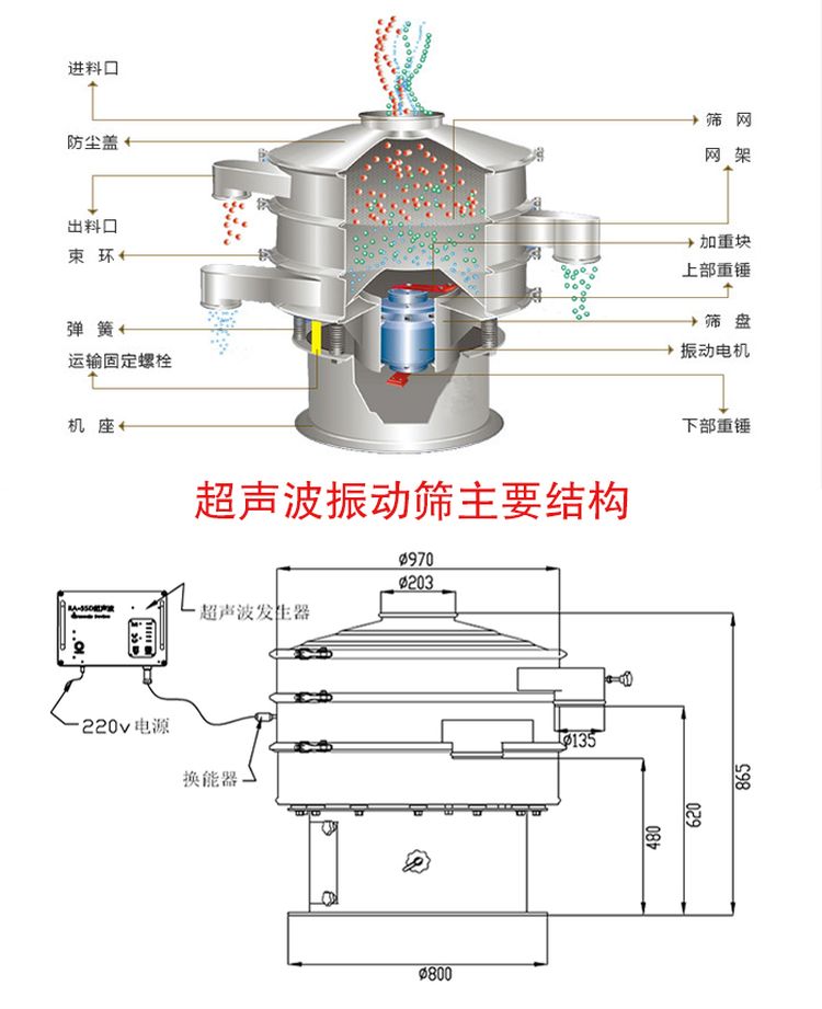超聲波振動(dòng)篩主要由換能器、超聲波電源、振動(dòng)電機(jī)、減震彈簧、防塵蓋等部分組成。超聲波振動(dòng)篩可將各種常用的低頻電能轉(zhuǎn)化為高達(dá)38KHz的高頻電能,再通過超聲換能器,zui終得到一個(gè)38KHz機(jī)械振動(dòng),既能夠提高篩分精度,又可以減少物料的堵網(wǎng)現(xiàn)象。