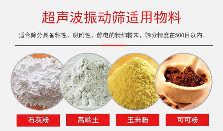 由于超聲波振動(dòng)篩加裝了超聲波篩分系統(tǒng),適合篩分具備粘性、吸附性、靜電的精細(xì)粉末,篩分精度在500目以內(nèi),所以在篩分比較細(xì)的物料超聲波振動(dòng)篩的還是站具很大得優(yōu)勢。