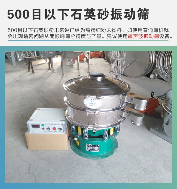 對于500目以下石英砂粉末來說已經(jīng)為高精細粉末物料,如使用普通篩機就會出現(xiàn)堵網(wǎng)問題從而影響篩分精度與產(chǎn)量。對于該類型的石英砂產(chǎn)品就需要使用到另一款篩分設備-超聲波振動篩。該系列篩機的清網(wǎng)裝置使用的是超聲波系統(tǒng),開啟后篩面會形成一個高頻低振幅的超聲振動波,使高精細粉末低空懸浮在篩面粗從而實現(xiàn)清網(wǎng)及解決堵網(wǎng)問題。