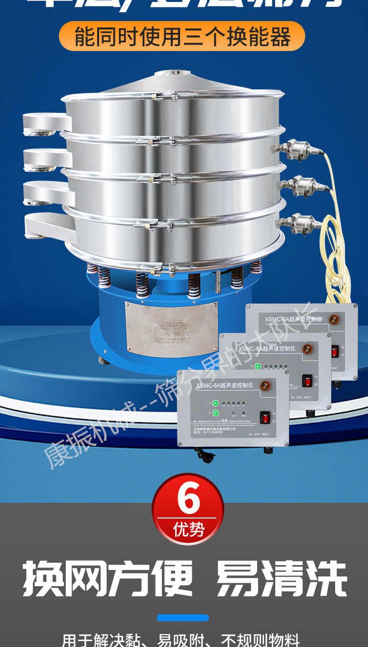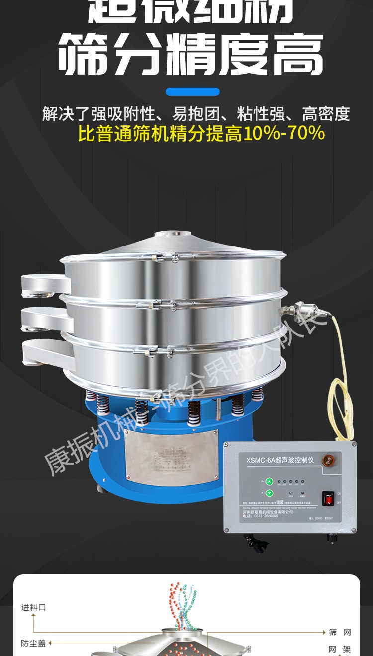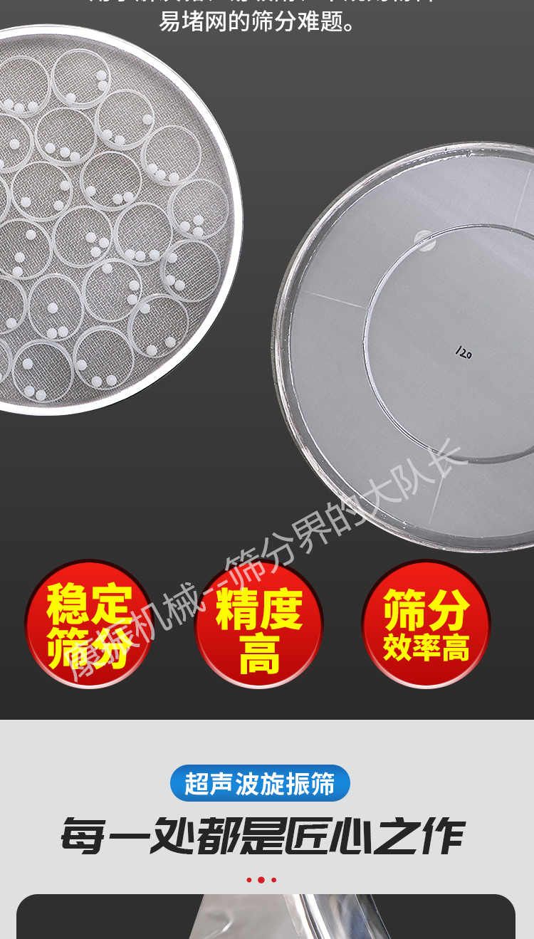 超聲波振動(dòng)篩是在旋振篩的基礎(chǔ)上引入了超聲波清網(wǎng)裝置,通過將220V、50Hz或110V、60Hz電能轉(zhuǎn)化為18KHz的高頻電能,輸入超聲換能器,將其變成18KHz機(jī)械振動(dòng),從而達(dá)到高篩分和迅速清網(wǎng)的目的,使超微細(xì)粉篩分成為易事。該系統(tǒng)在傳統(tǒng)的振動(dòng)篩基礎(chǔ)上在篩網(wǎng)上引入一個(gè)低振幅、高頻率的超聲振動(dòng)波(機(jī)械波),以改善超微細(xì)粉體的篩分性能。特別適合高附加值精細(xì)粉體的用戶使用。超聲波篩分系統(tǒng)是一種簡單實(shí)用、可靠的篩分系統(tǒng),是當(dāng)前網(wǎng)孔堵塞的有效的解決方法??蓮V泛應(yīng)用于制藥、冶金、化工、選礦、食品等要求精細(xì)篩分過濾的行業(yè),篩分過濾精度高,有效解決因團(tuán)聚、靜電、強(qiáng)吸附性卡堵網(wǎng)孔等篩分難題,是國內(nèi)篩分行業(yè)的一項(xiàng)重大技術(shù)突破。