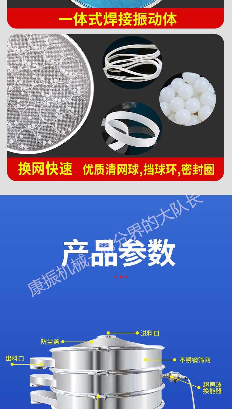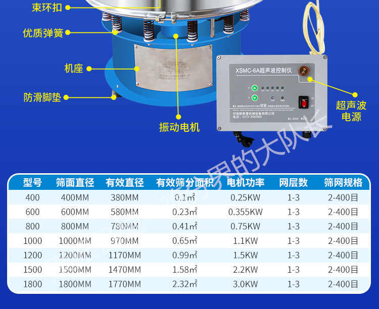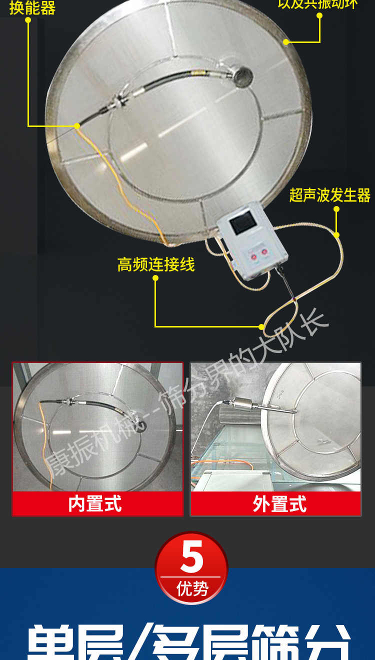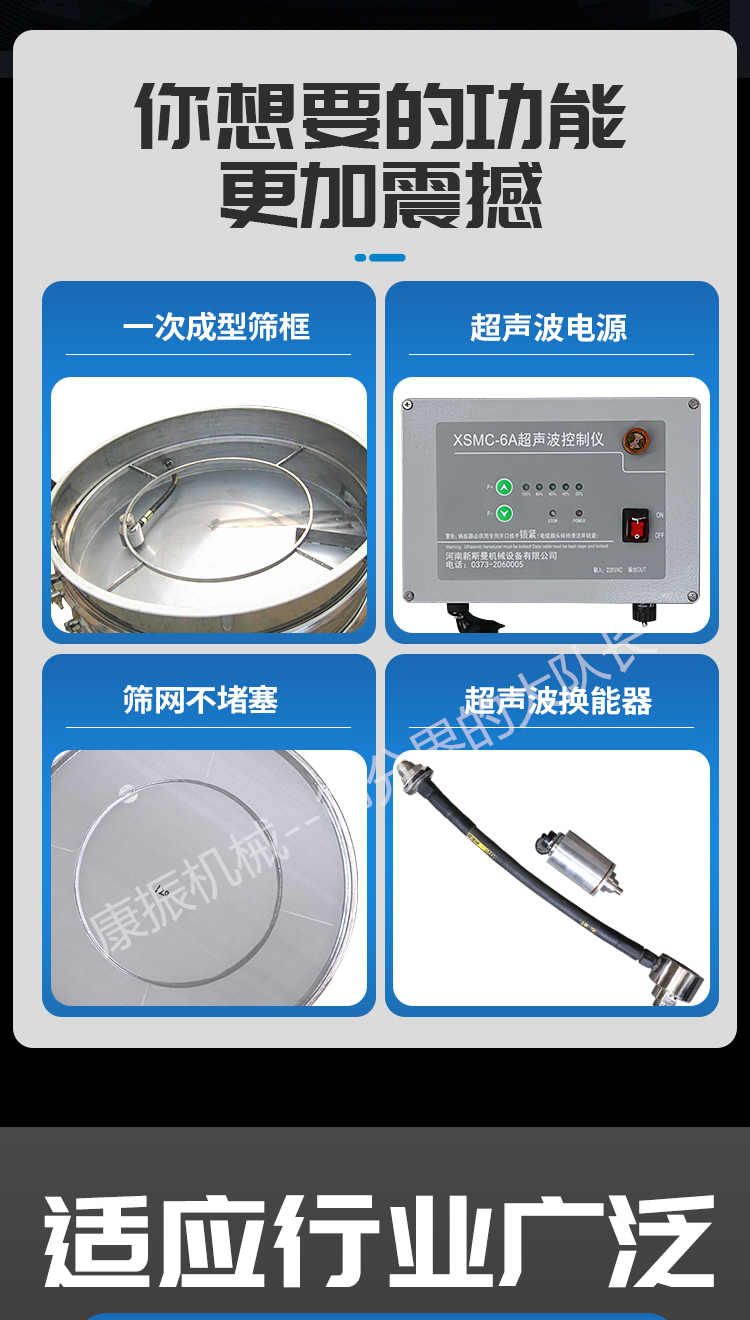 超聲波振動(dòng)篩是在旋振篩的基礎(chǔ)上引入了超聲波清網(wǎng)裝置,通過將220V、50Hz或110V、60Hz電能轉(zhuǎn)化為18KHz的高頻電能,輸入超聲換能器,將其變成18KHz機(jī)械振動(dòng),從而達(dá)到高篩分和迅速清網(wǎng)的目的,使超微細(xì)粉篩分成為易事。該系統(tǒng)在傳統(tǒng)的振動(dòng)篩基礎(chǔ)上在篩網(wǎng)上引入一個(gè)低振幅、高頻率的超聲振動(dòng)波(機(jī)械波),以改善超微細(xì)粉體的篩分性能。特別適合高附加值精細(xì)粉體的用戶使用。超聲波篩分系統(tǒng)是一種簡單實(shí)用、可靠的篩分系統(tǒng),是當(dāng)前網(wǎng)孔堵塞的有效的解決方法??蓮V泛應(yīng)用于制藥、冶金、化工、選礦、食品等要求精細(xì)篩分過濾的行業(yè),篩分過濾精度高,有效解決因團(tuán)聚、靜電、強(qiáng)吸附性卡堵網(wǎng)孔等篩分難題,是國內(nèi)篩分行業(yè)的一項(xiàng)重大技術(shù)突破。