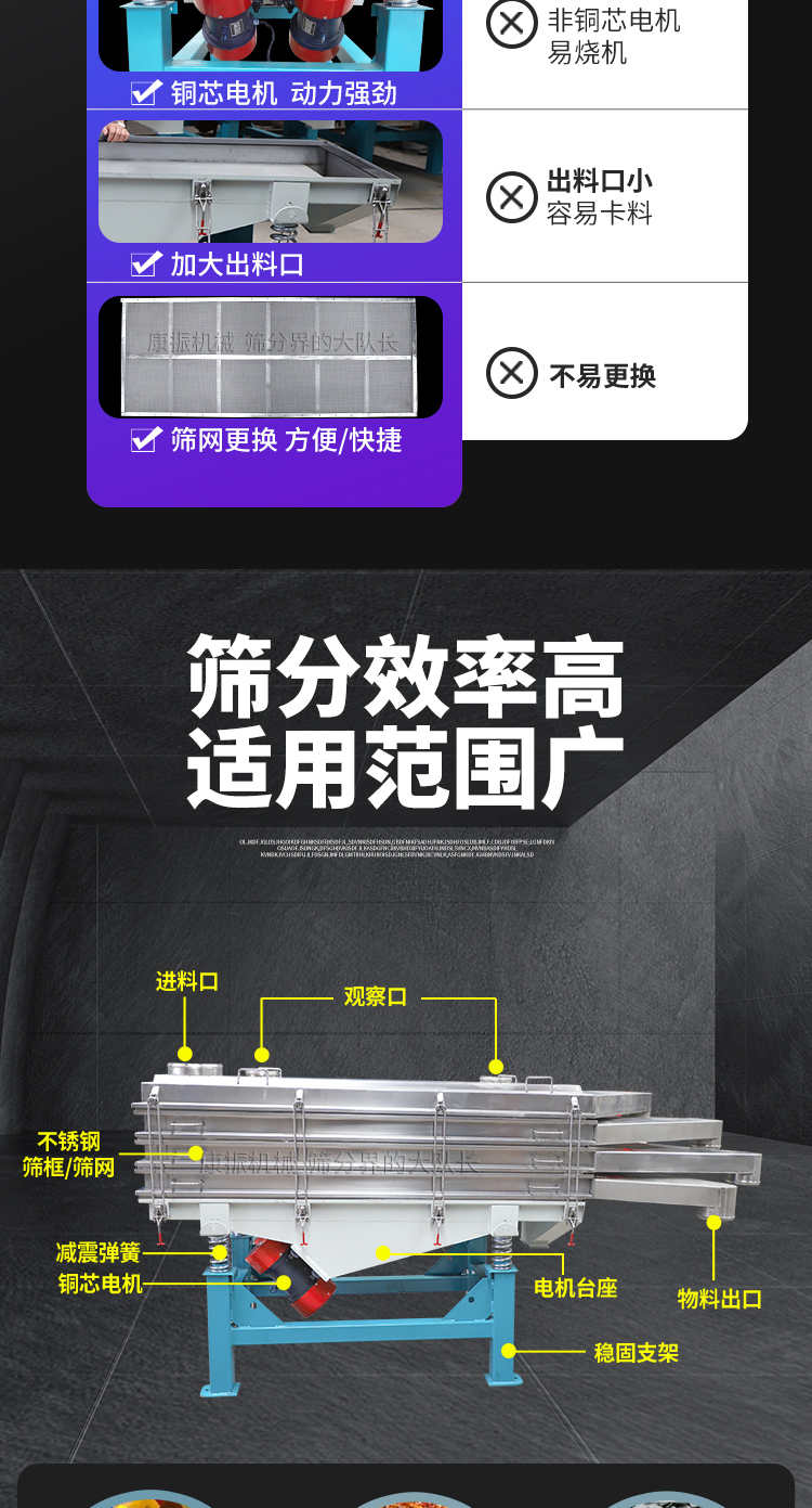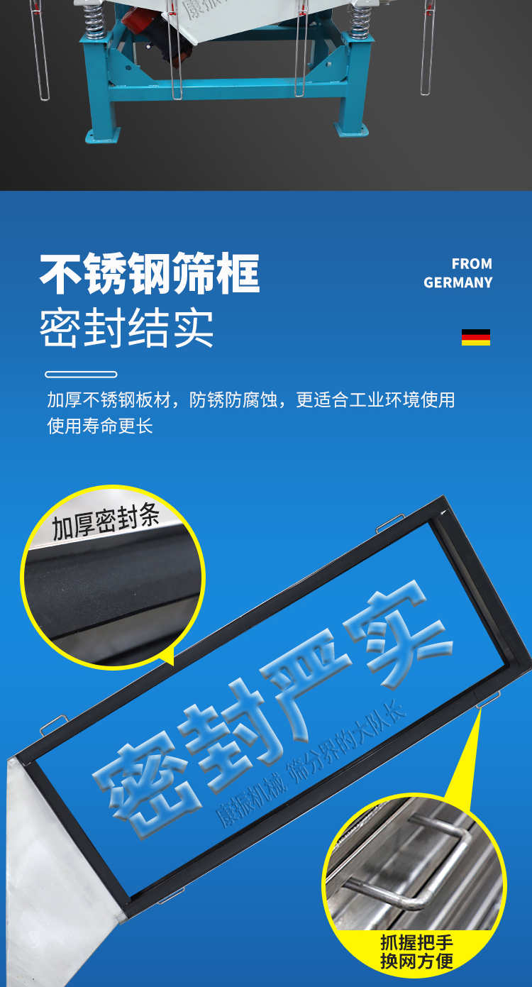 直線振動(dòng)篩(直線篩)穩(wěn)定可靠、消耗少、噪音低、壽命長(zhǎng)、振型穩(wěn)、篩分效率高等優(yōu)點(diǎn)。