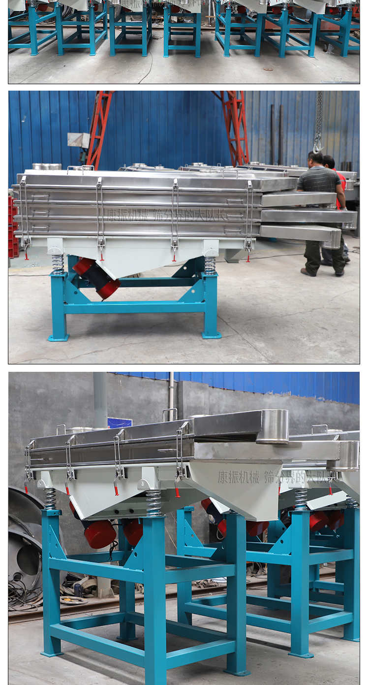 直線振動(dòng)篩利用振動(dòng)電機(jī)激振作為振動(dòng)源,使物料在篩網(wǎng)上被拋起,同時(shí)向前作直線運(yùn)動(dòng),物料從給料機(jī)均勻地進(jìn)入篩分機(jī)的進(jìn)料口,通過多層篩網(wǎng)產(chǎn)生數(shù)種規(guī)格的篩上物、篩下物、分別從各自的出口排出。具有耗能低、產(chǎn)量高、結(jié)構(gòu)簡(jiǎn)單、易維修、全封閉結(jié)構(gòu),無粉塵溢散,自動(dòng)排料,更適合于流水線作業(yè)。