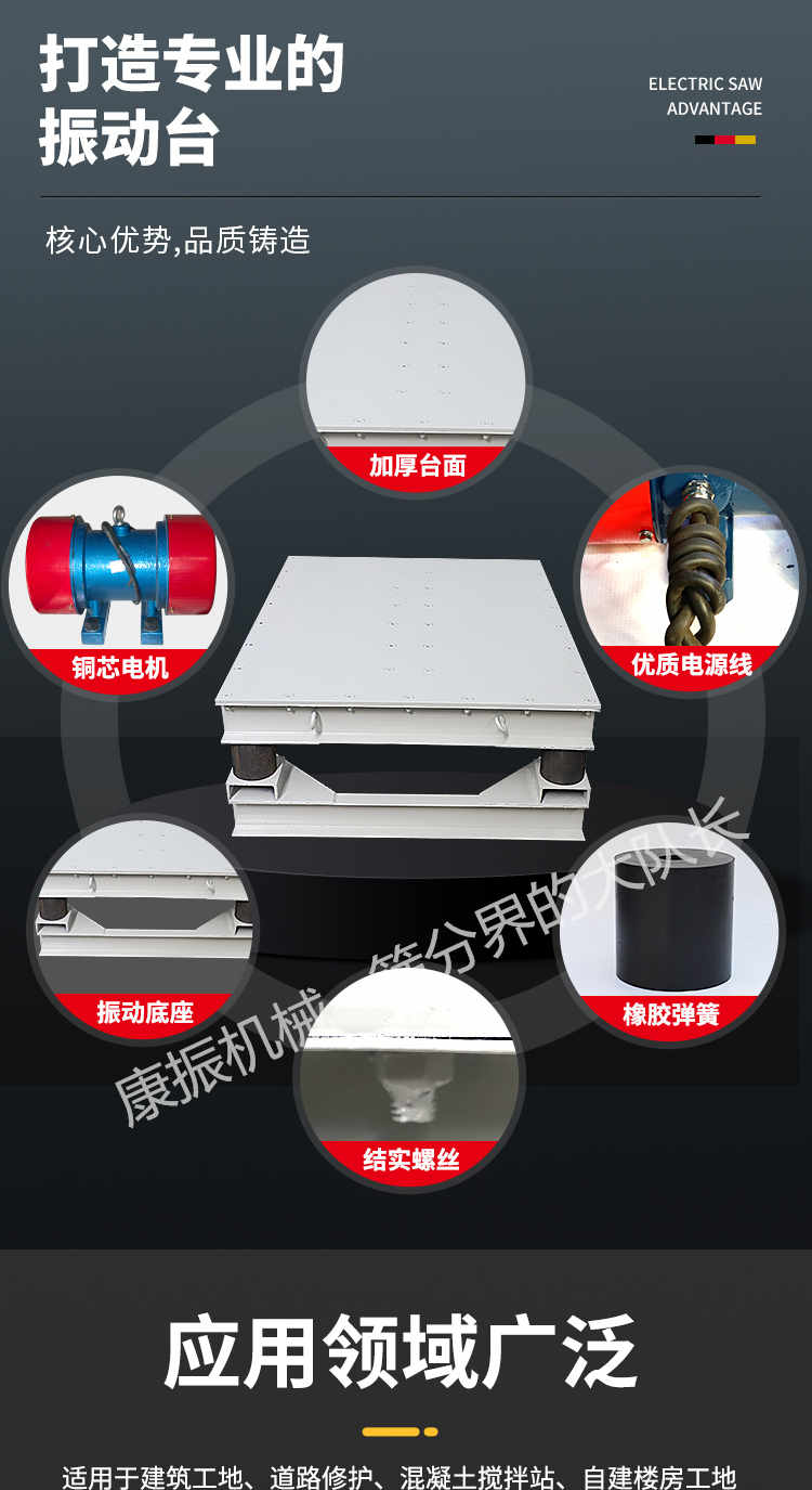 被廣泛應(yīng)用于試驗(yàn)室、現(xiàn)場工地作試件成型和預(yù)制構(gòu)件震實(shí)各種板柱、梁等混凝土構(gòu)件振實(shí)成型,并應(yīng)用在冶金、模具、食物、化工、建材等行業(yè)。