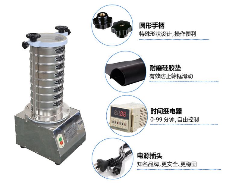 使每層試驗(yàn)篩內(nèi)只留相同粒度的物料,達(dá)到不同粒度的分離并確定此物料的粒度組成,使篩框中的物料能非常有效的起到過濾、分級(jí)、篩分目的。
