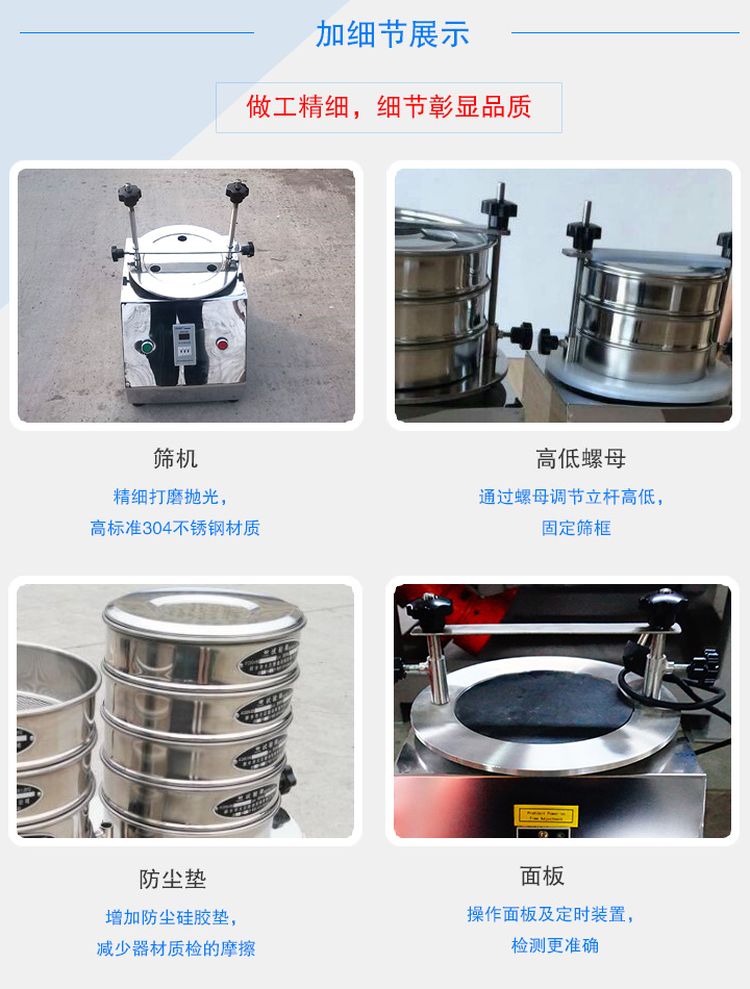 規(guī)格:Φ200*50和Φ200*25,篩框、篩蓋、篩底選用**不銹鋼拉伸拋光而成。