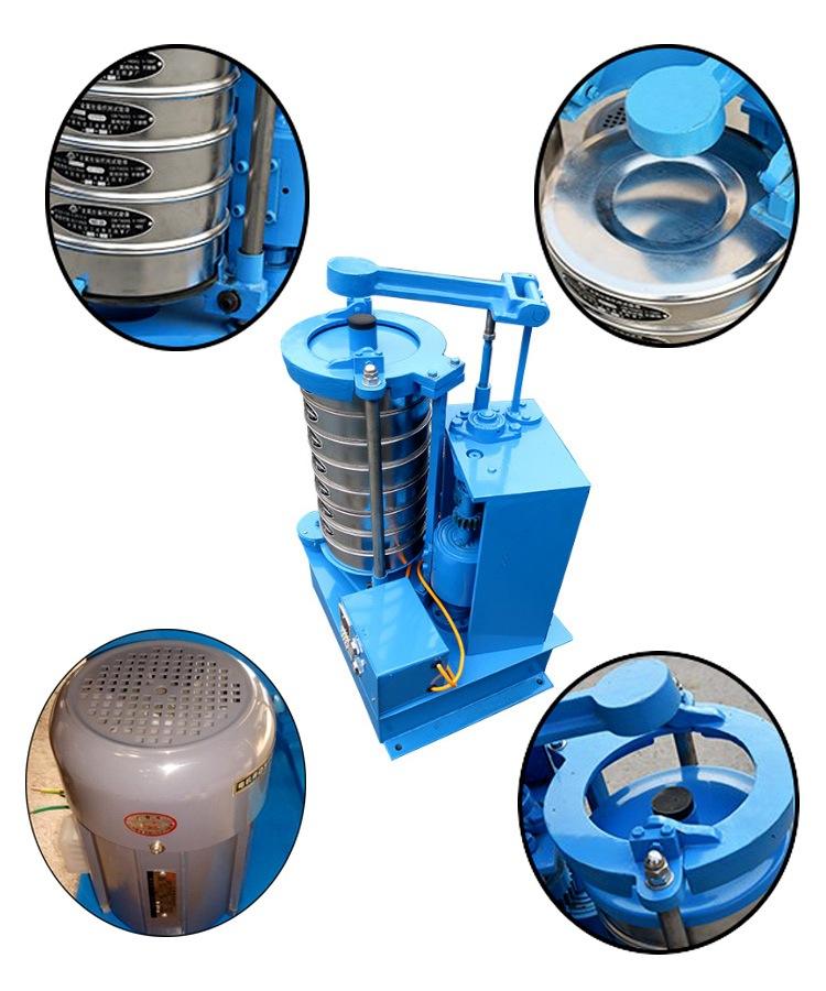 電機(jī)帶動齒輪通過同步帶傳動到主軸上,經(jīng)齒輪變速后主軸按要求的轉(zhuǎn)速轉(zhuǎn)動,主軸帶動偏心輪使滑板做往復(fù)運(yùn)動,帶動安裝在滑板托盤中的試驗(yàn)篩左右搖動,同時主軸帶動頂桿齒輪轉(zhuǎn)動,變速后頂桿齒輪通過凸輪頂擊頂桿,頂桿使拍錘上下拍擊試驗(yàn)篩上蓋,使得試驗(yàn)篩、分樣篩中的物料往復(fù)和上下振動,使小于試驗(yàn)篩的篩面網(wǎng)孔的物料顆粒篩分進(jìn)下層試驗(yàn)篩,如此層層篩選,使每層試驗(yàn)篩內(nèi)只留相同粒度的物料。達(dá)到不同粒度的分離并確定此物料的粒度組成。