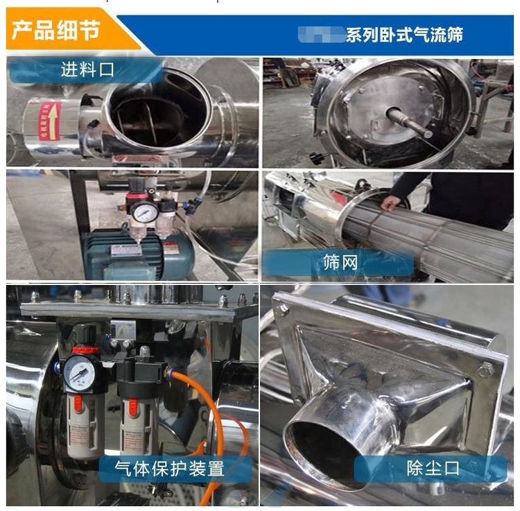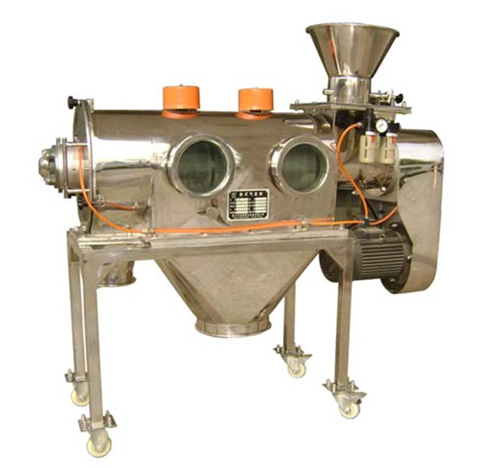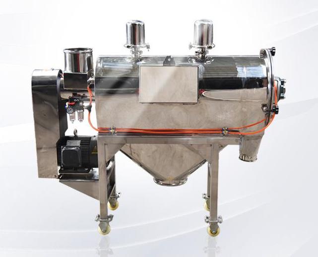 臥式氣流篩篩網(wǎng)為圓筒狀,置于機(jī)體內(nèi),物料通過(guò)螺旋輸送系統(tǒng)后,和氣流混合、霧化進(jìn)入網(wǎng)筒內(nèi);